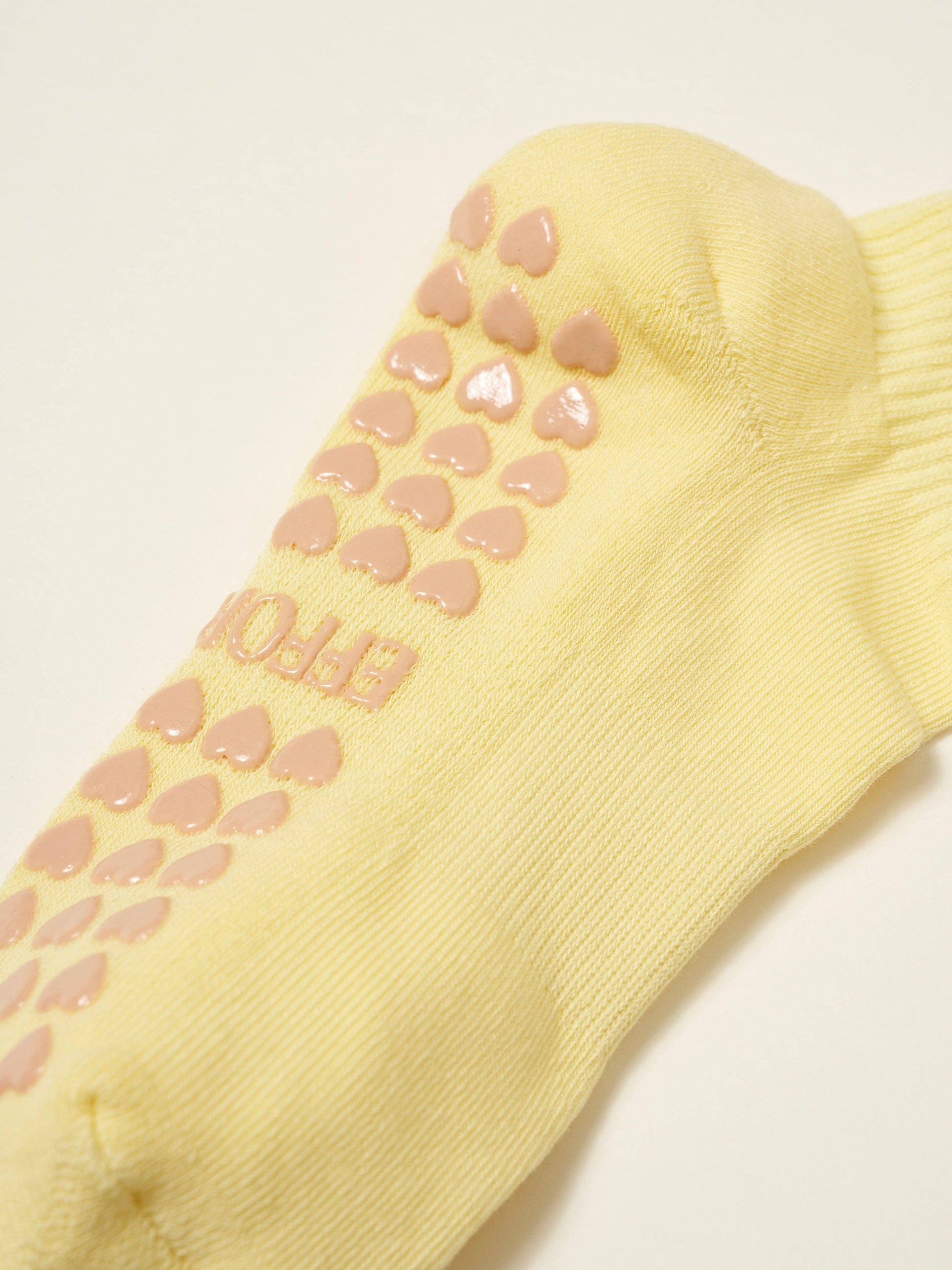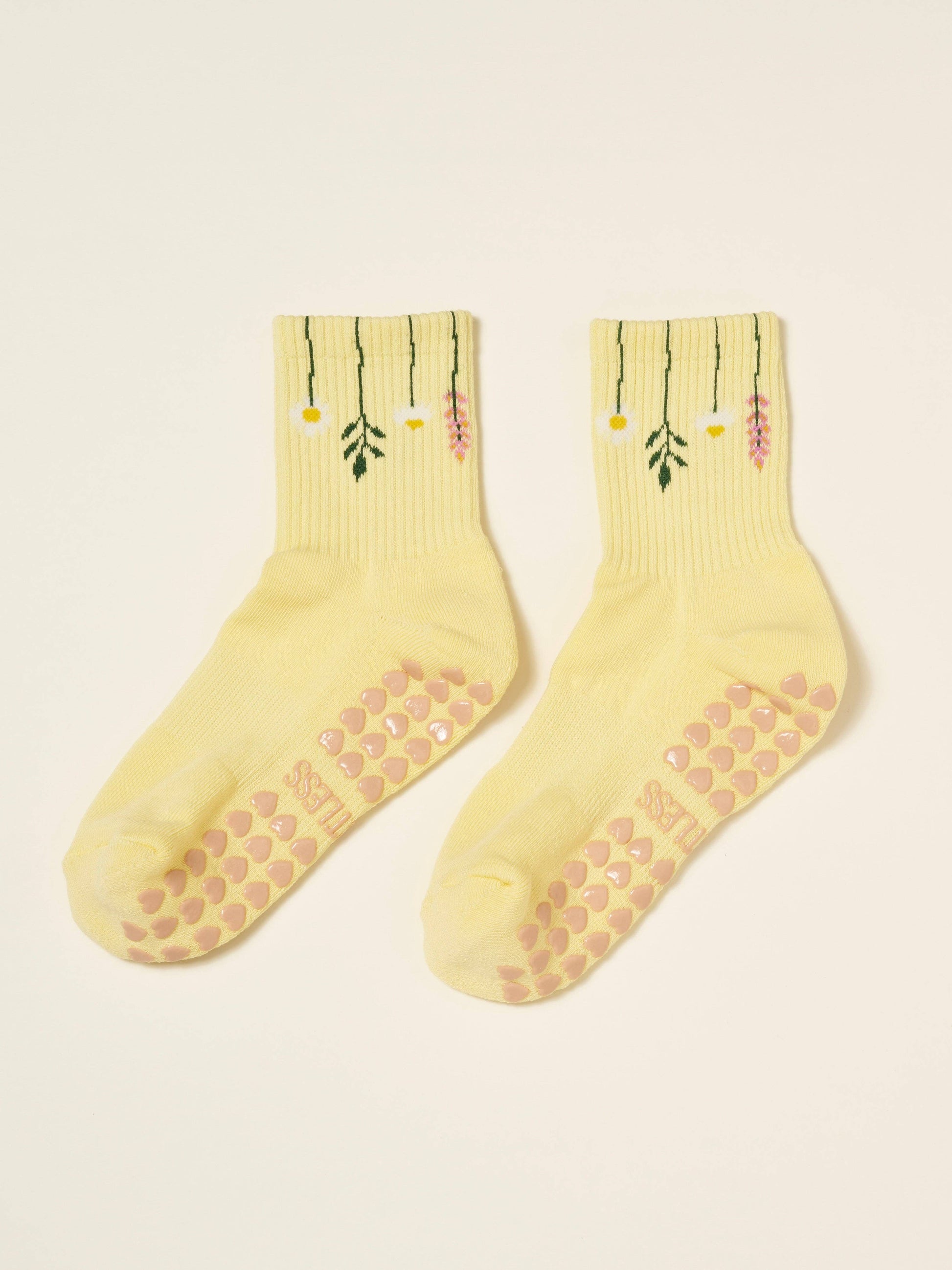 These grip socks are made with thick organic cotton materials, have a cushioned footbed and woven arch support. Dry on low tumble.