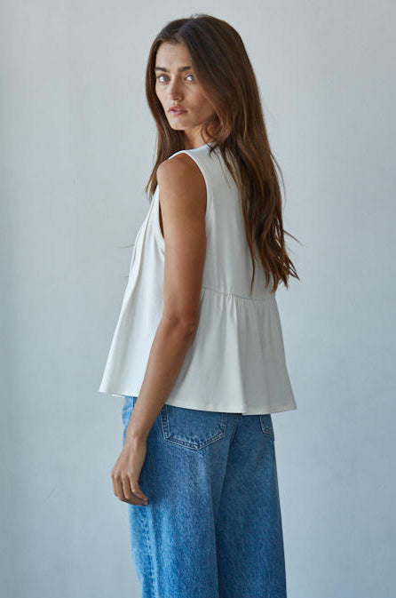 A fun twist on a basic tank - this round neck wide sleeve tank top has pleated details down the front, a peplum looking bottom half, and is a super soft jersey fabric.