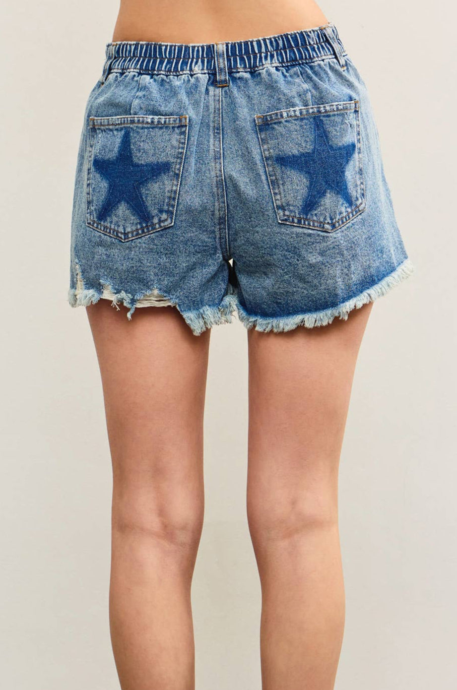 Comfy washed denim shorts with an elastic back waistband, frayed hem and distressing on the front, and star printed back pockets.