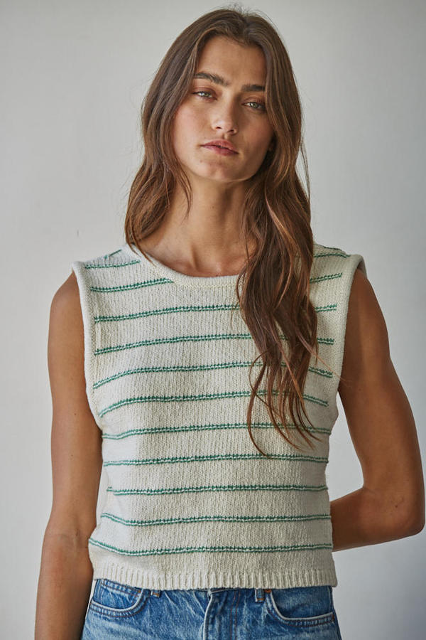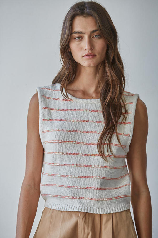 A contrast stripe knitted sleeveless top with a crew neck and low square back.