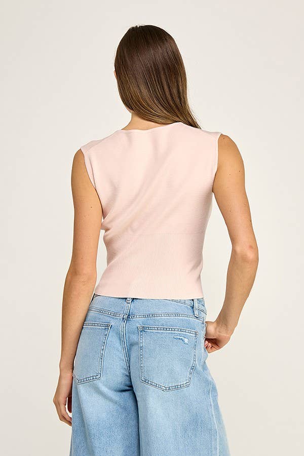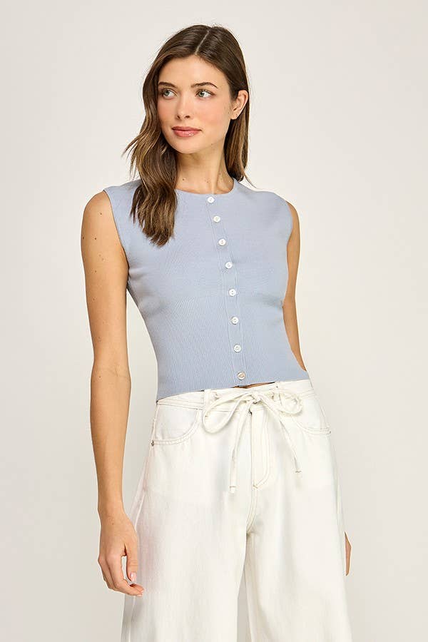 A sleeveless knit top featuring a button front design with a fitted cropped silhouette. Made from a soft ribbed knit with natural stretch for a flattering and comfortable fit.