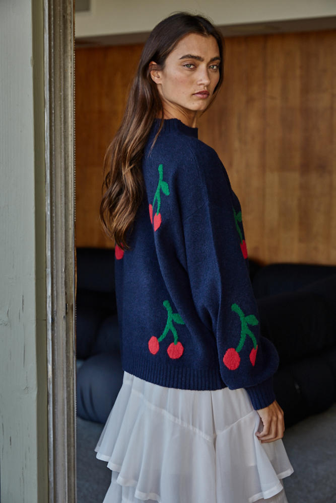 A knitted mock neck sweater with rib knit trim and Cherry detailing.