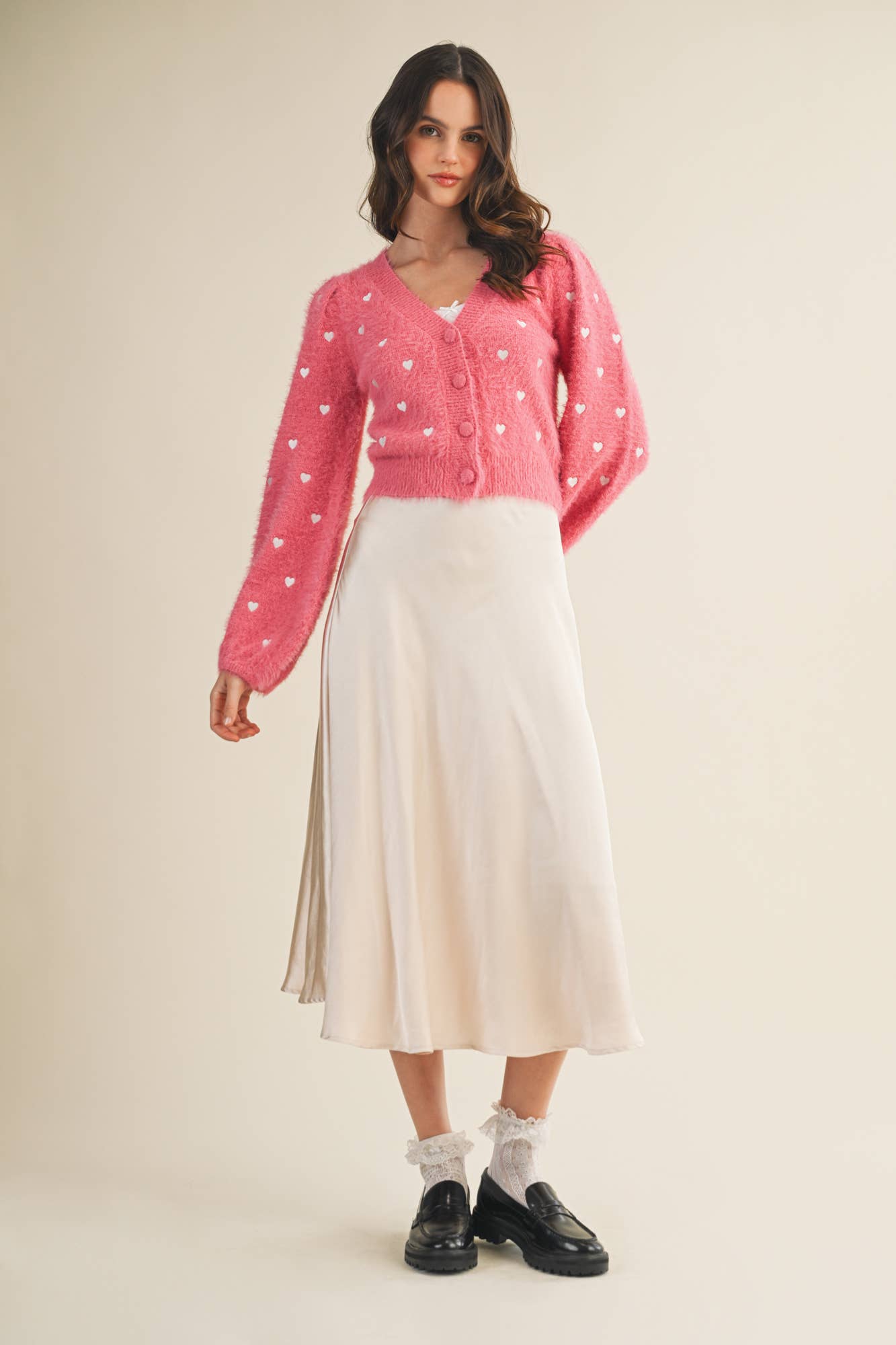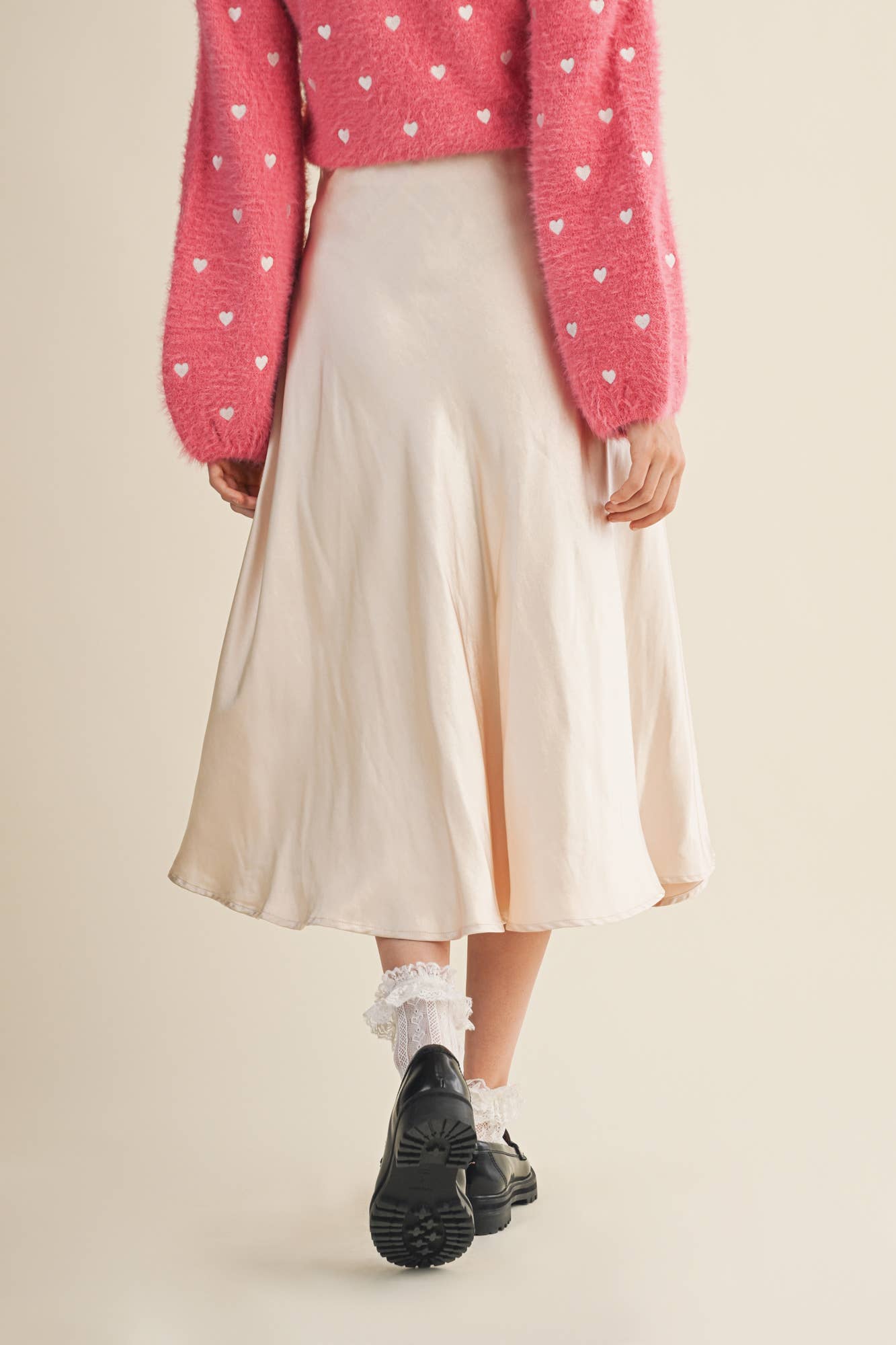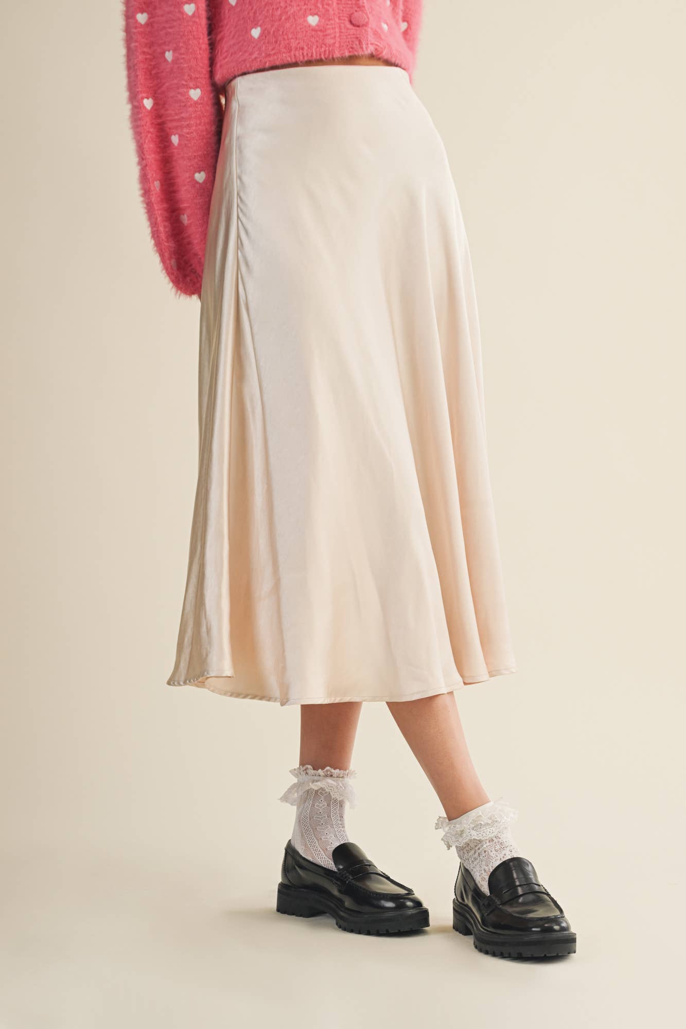 A flared high rise satin midi length skirt with a side zipper closure.