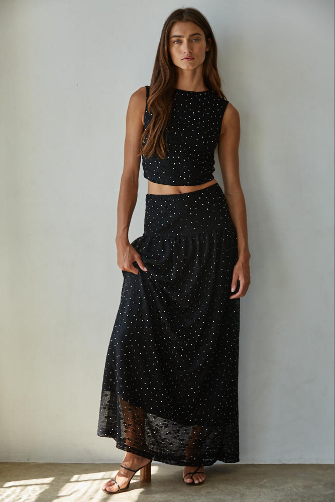 A round neck sleeveless tank top with sewn-in sparkle beading and interior lining.