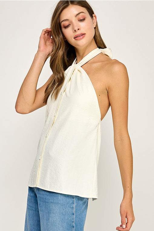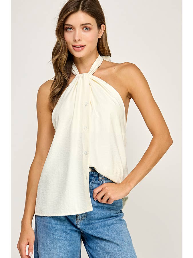 A high neck halter style top in a flowy lightweight fabric that features a knot detail at the neck and a button details down the front.