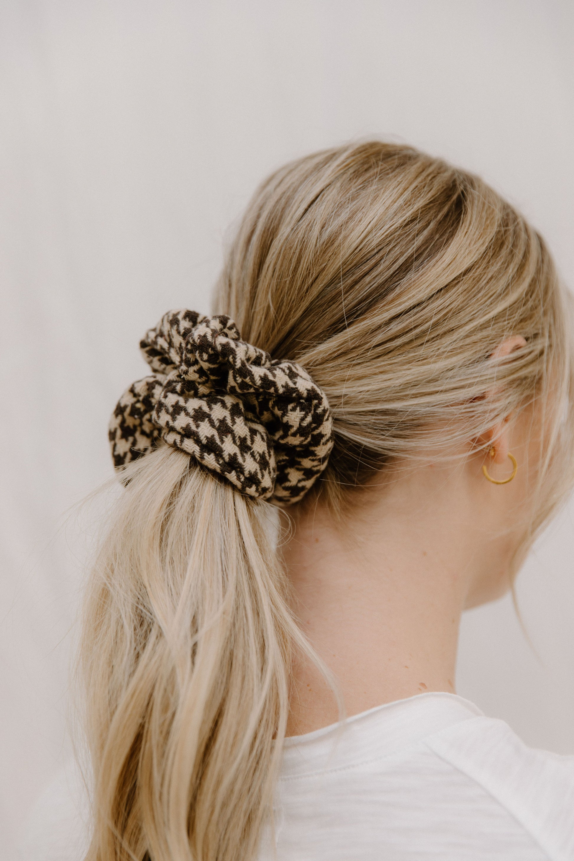 This oversized scrunchie is the perfect addition to your fall accessories. It is made in a thicker sweater style fabric in the perfect houndstooth pattern! It'll be the perfect addition to your hairstyles this fall.