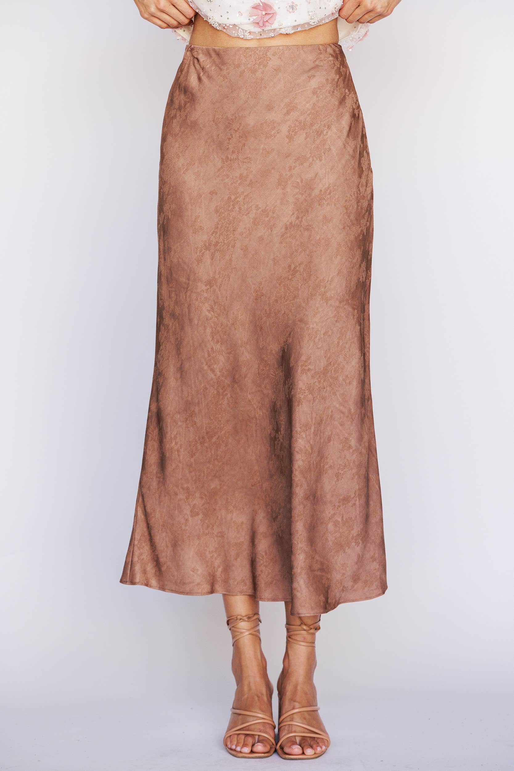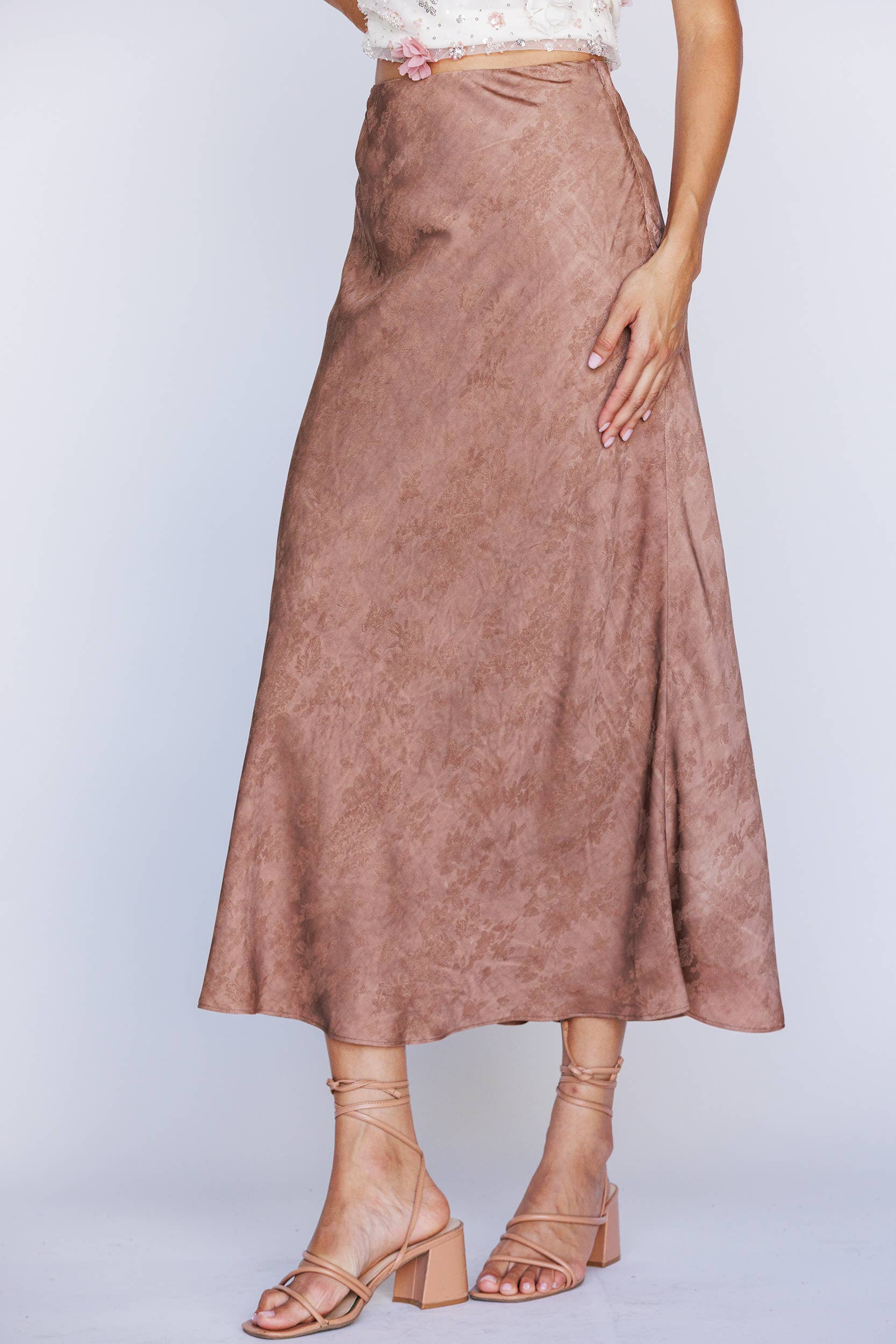 Sleek high rise satin midi skirt with a jacquard floral pattern, side zipper, and is fully lined.
