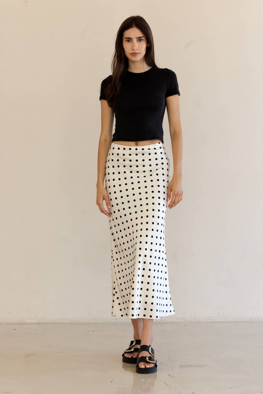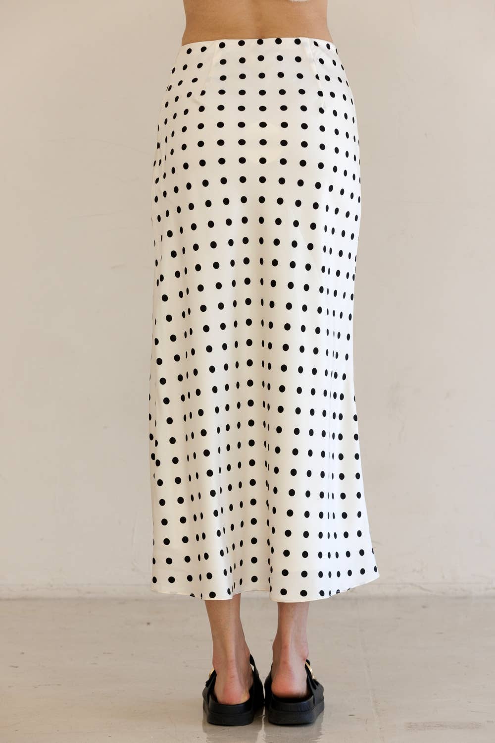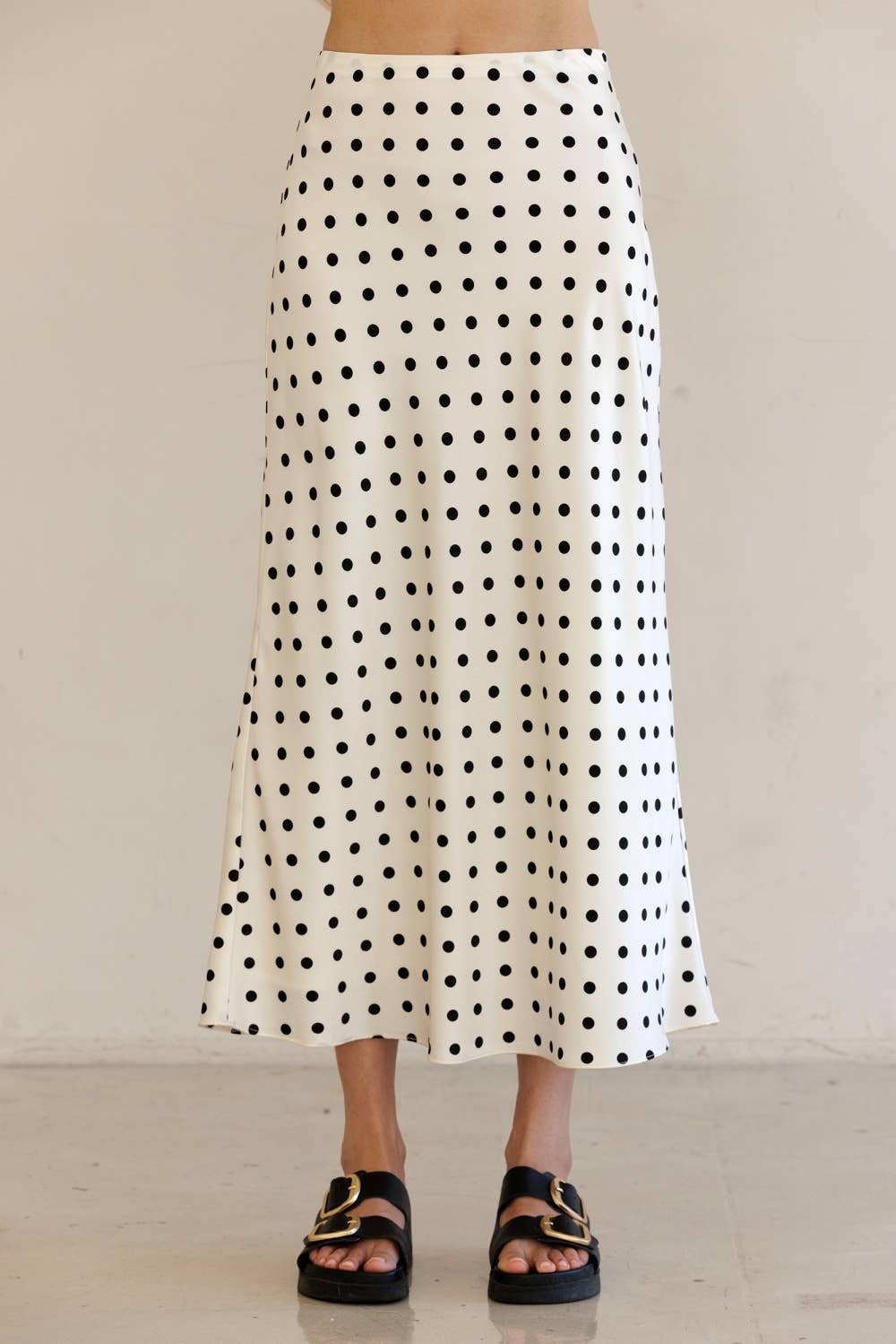A timeless polka dot print on a smooth satin midi length skirt. This skirt features a flowy a-line silhouette and an invisible zipper.