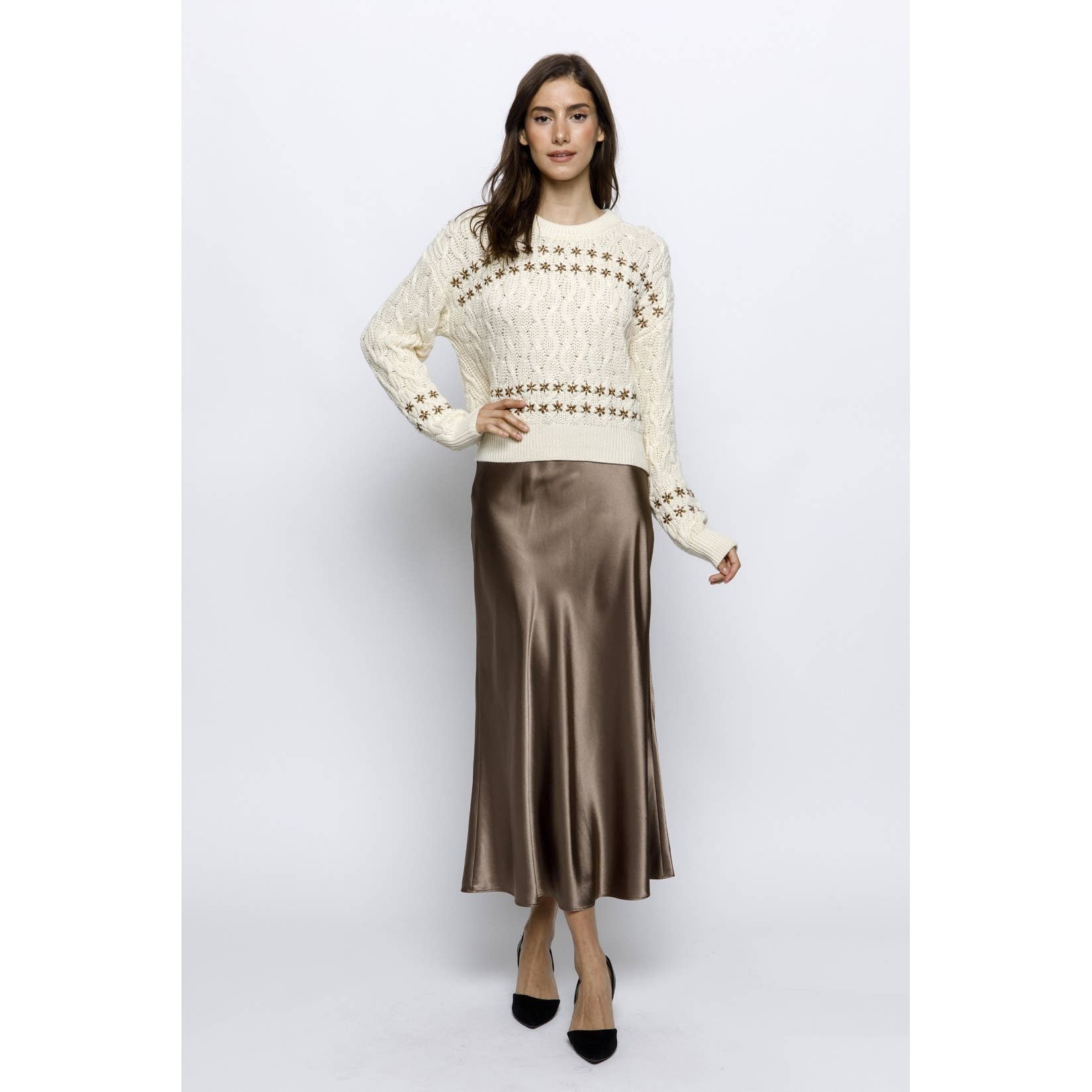 A monochromatic high waisted satin midi skirt with a side invisible zipper.