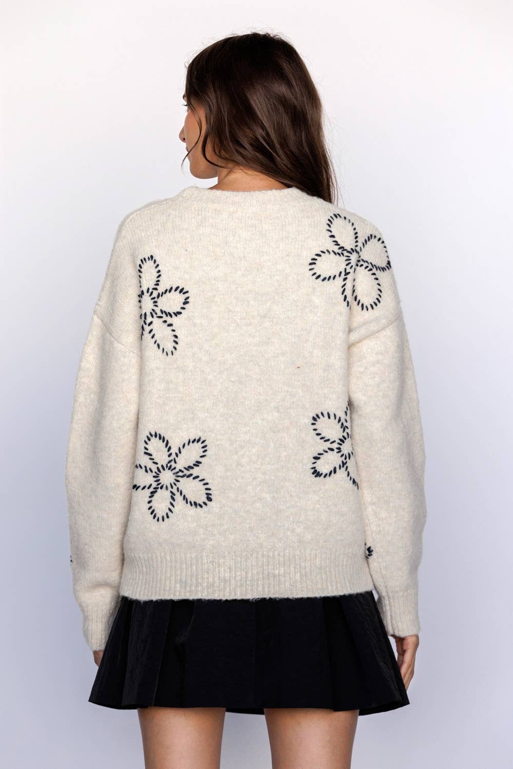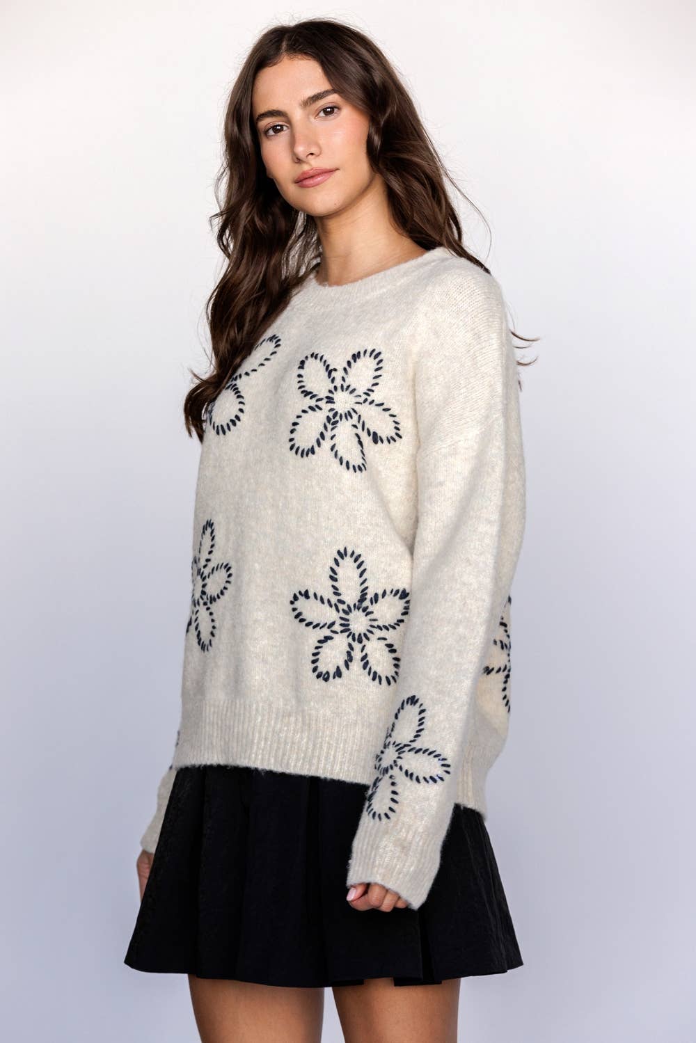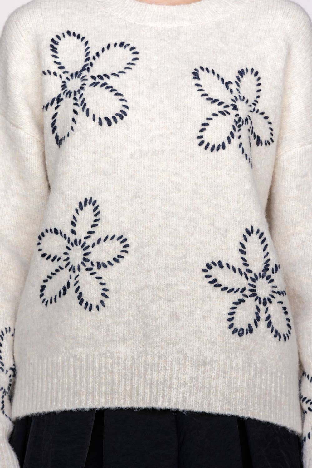 A classic dropped shoulder crewneck knitted sweater with ribbed trim and black floral embroidery throughout.