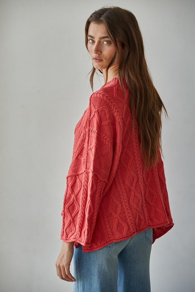 Lightweight cable knit sweater with 3/4 length sleeves that have a subtle balloon effect to them, a slightly cropped length, and rib knit round neck collar.