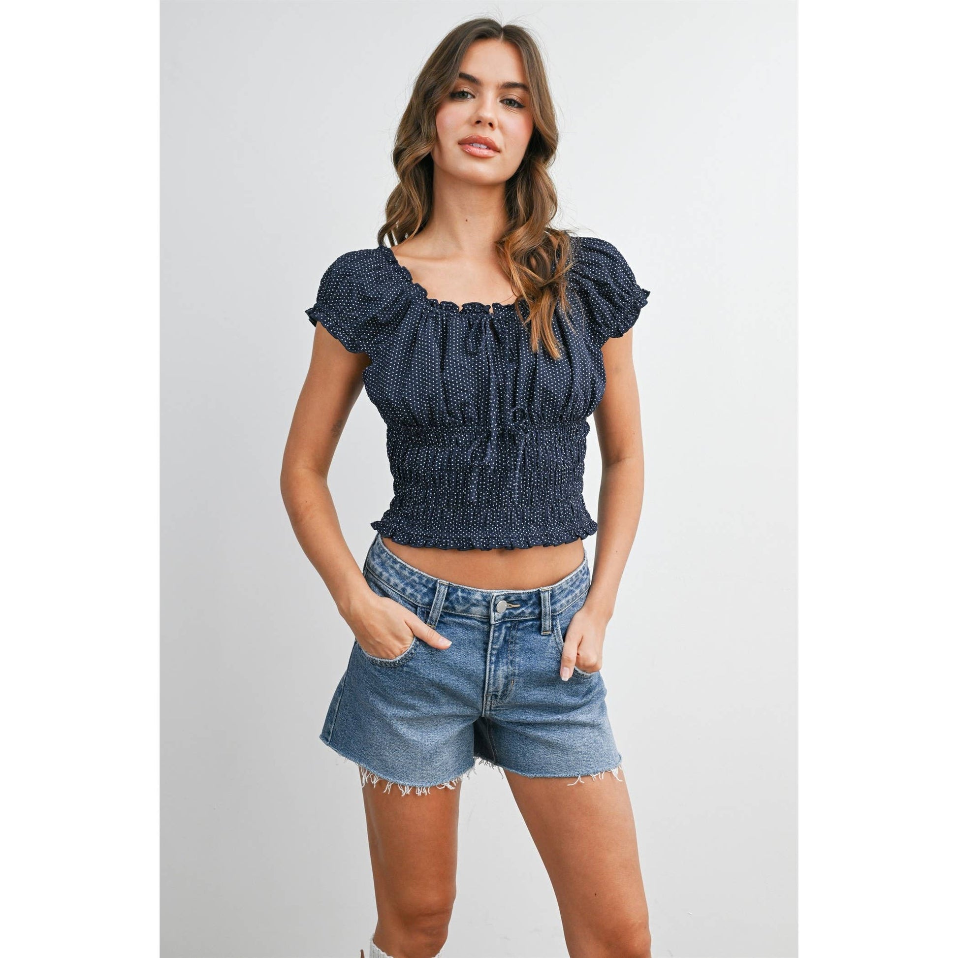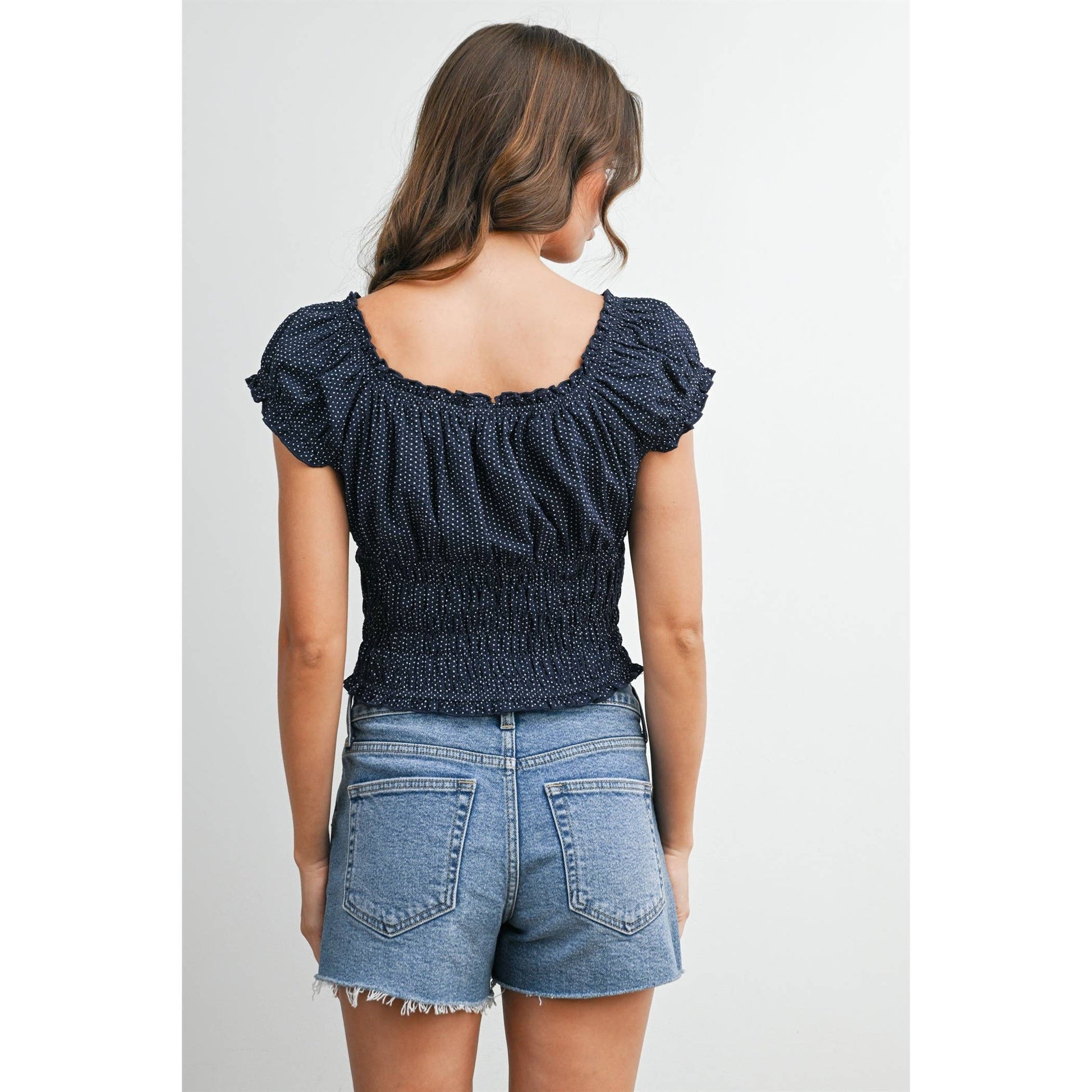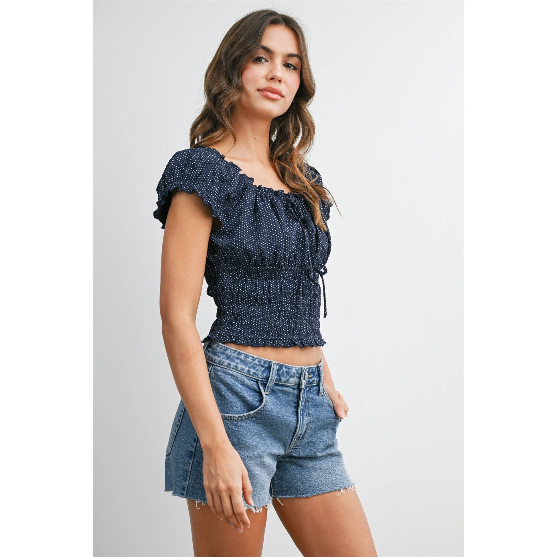 A square neck polka dot crop top with all over ruching for maximum stretch and comfort, two small bow tie details, and puffy cap sleeves.