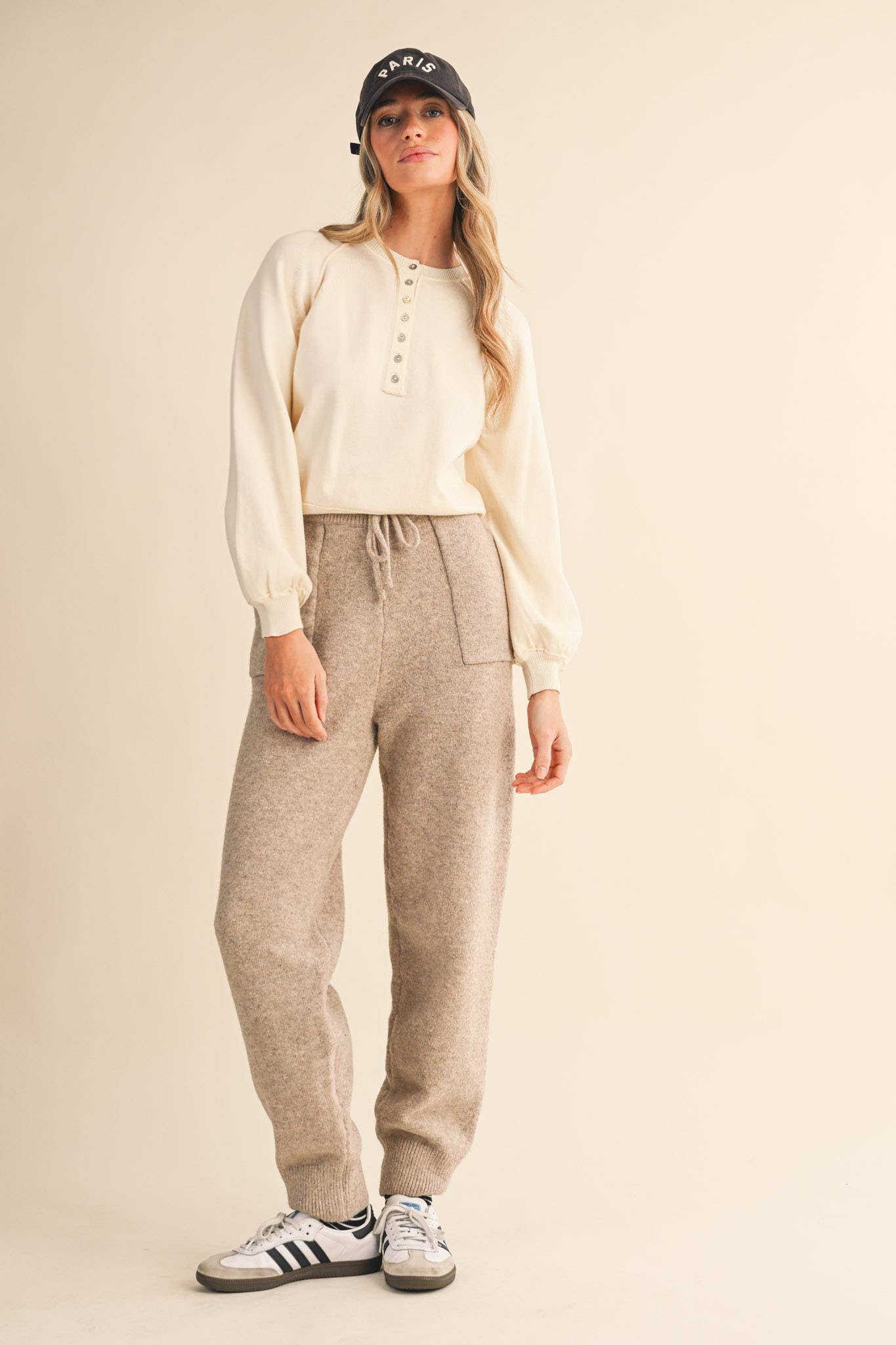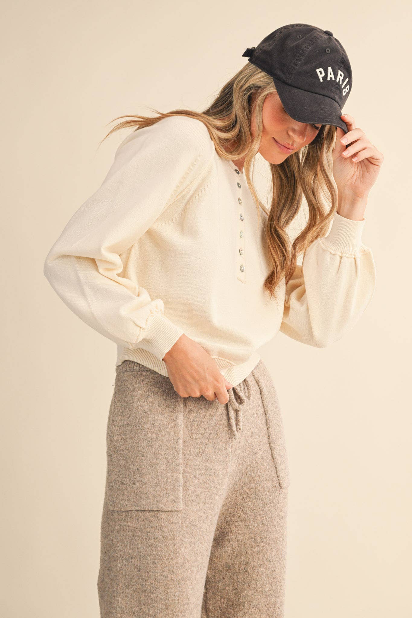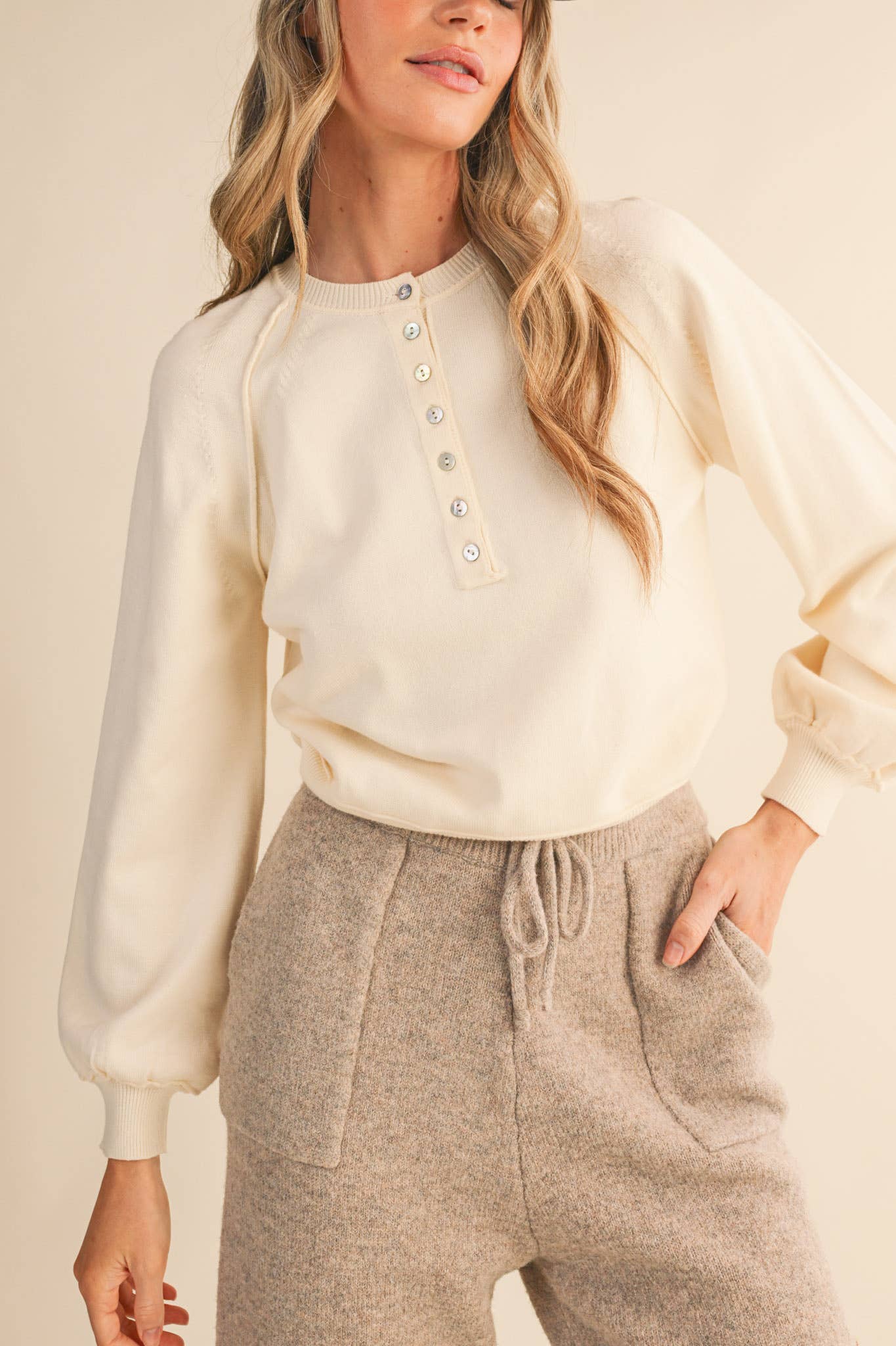 A pullover henley style sweater with half length buttons up the front with a round neck and puff sleeves. The hemlines are a ribbed knit and there are stitched seam accent details.