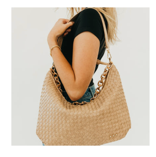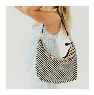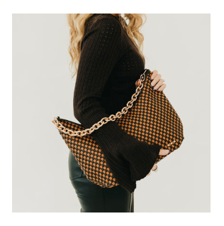 This woven bag features a slouchy look, a metal chain detailing, and a shoulder strap.