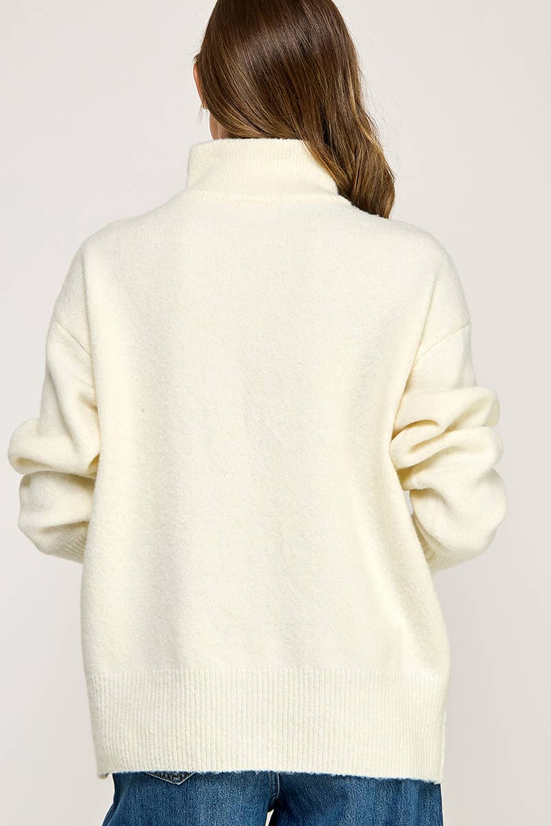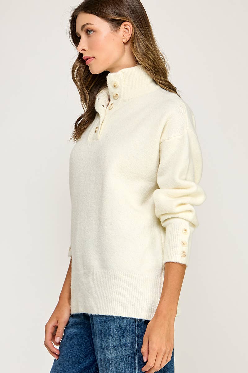 This cozy striped sweater features a chic high collar with button details on the collar and sleeves and a ribbed knit hemline detail.