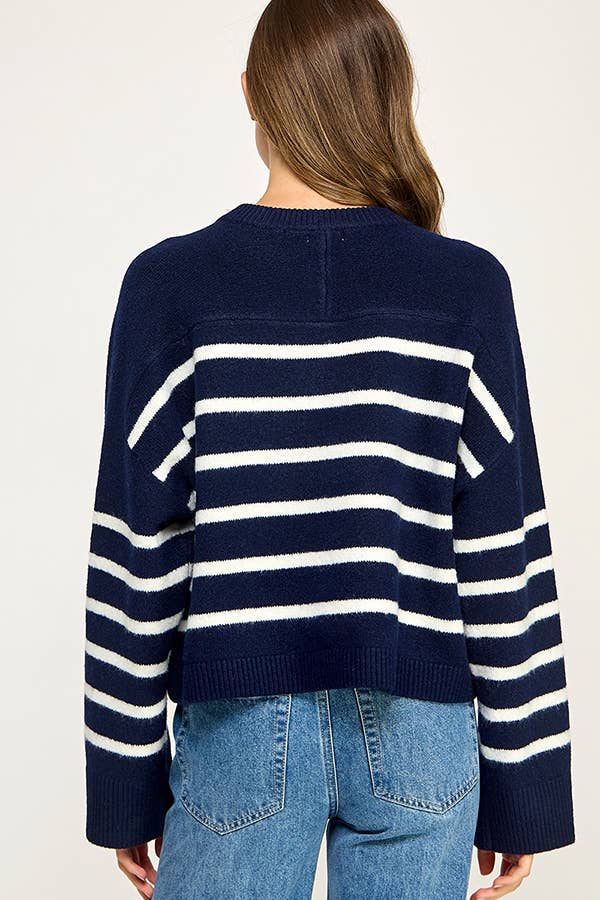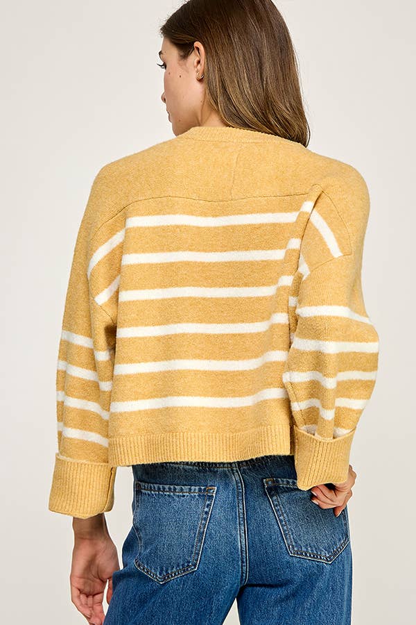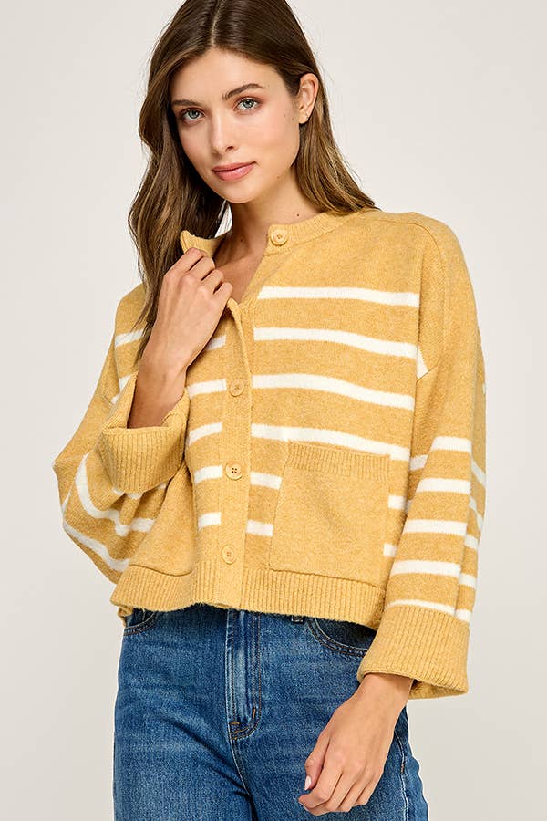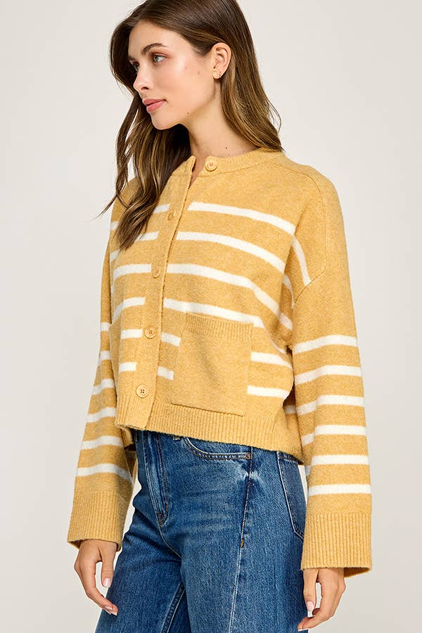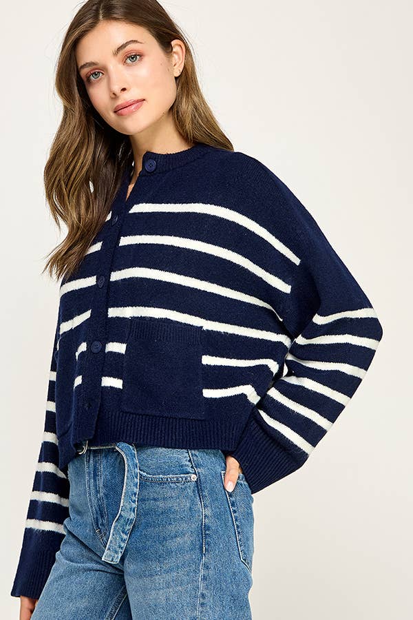 A relaxed cardigan with a bold stripe pattern, a button front, and drop shoulders.