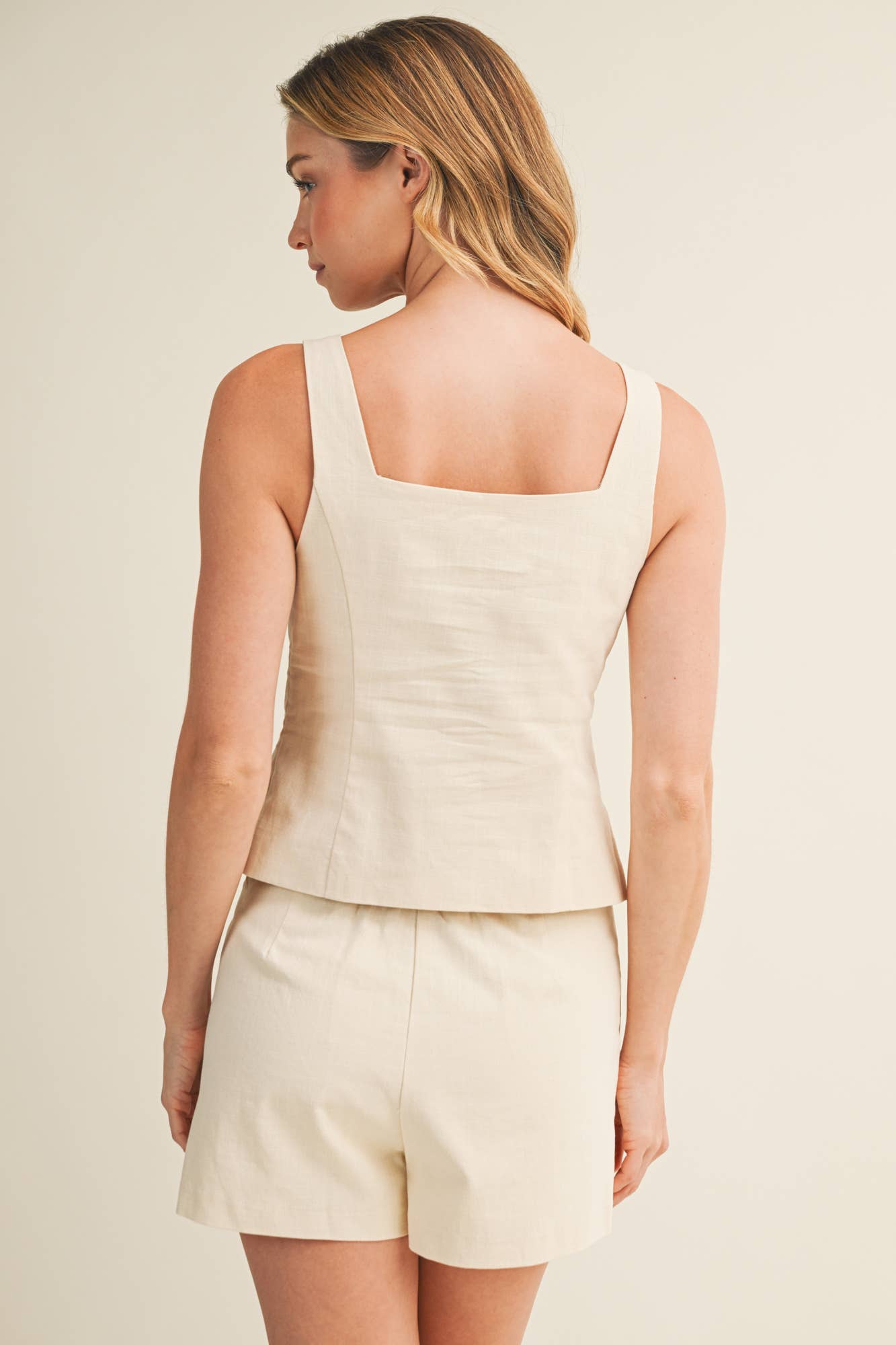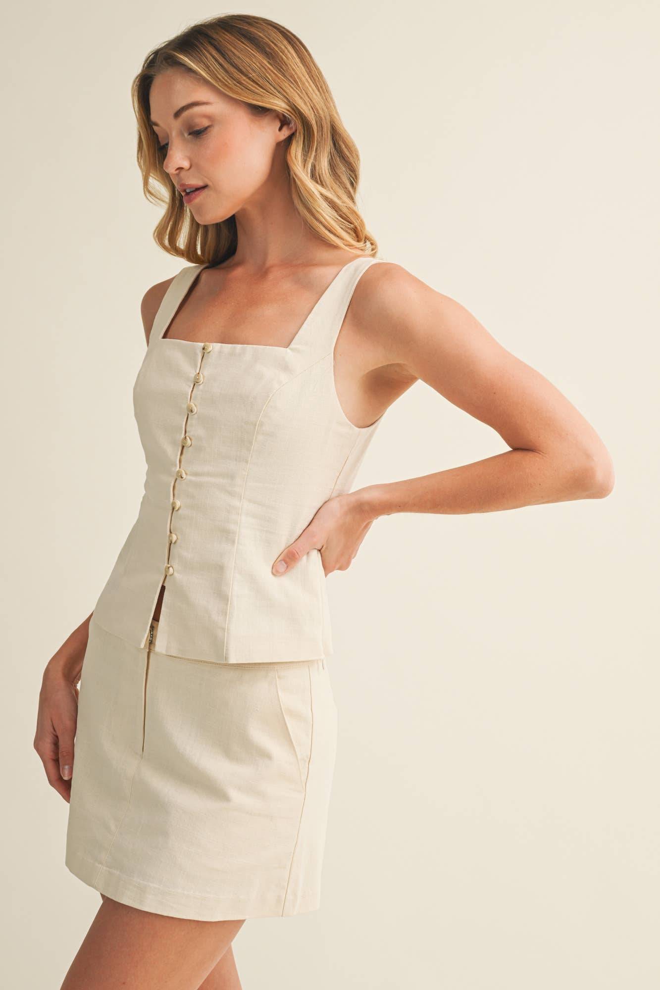 A tailored-style square neck button up top with a side zipper closure.
