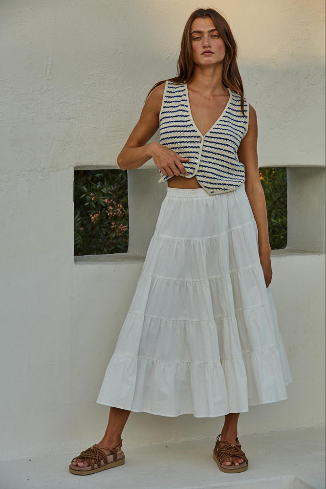 A cream and navy contrast V-Neck knit vest with mother of pearl button detail.